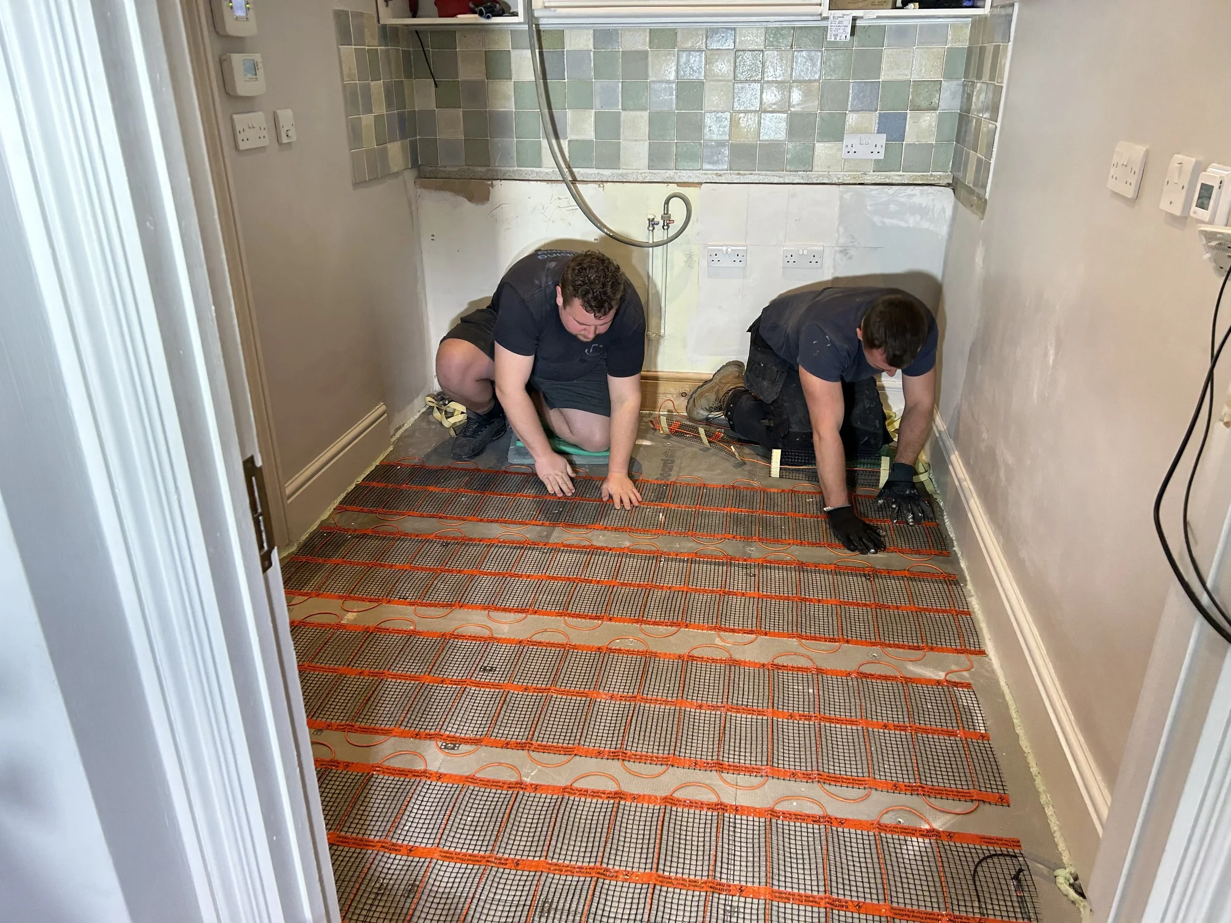 We removed substandard floors in a utility room, WC and plant room. This required us to screed the solid floor, re lay caber flooring (ready to install underfloor heat matting), self levelling compound (ready for tiles), new sockets and lights. This is all part of an ongoing project where half the house is due to be re-wired and overhauled.
